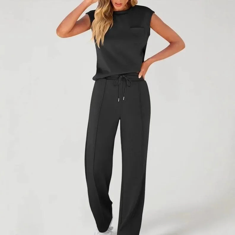 DETALHES DE BOLSOS ELEGANTES E FUNCIONAIS – ESTÉTICA E PRATICIDADE EM UNIÃO – A blusa possui um bolso frontal para guardar pequenos objetos com praticidade. Cada lateral da calça conta com um bolso, complementando o visual e, ao mesmo tempo, melhorando o uso e a conveniência no dia a dia.